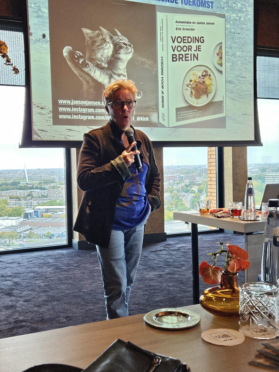 Na de lunch stroomden meer verzekeringsartsen de zaal binnen om het wetenschappelijke programma te volgen. Allereerst kregen we een lezing over gezonde (mediterrane) voeding van cardioloog Annemieke Jansen, die geflankeerd werd door haar zus Janine Jansen, kok en fotograaf van beroep. We weten nu alles van polyfenolen in extra vierge oliefolie, noten, zaden, fruit, groenten, peulvruchten, cacao, koffie, thee en rode wijn. Dat niet alleen, ook weten we nu hoe we suikers kunnen herkennen en welke voedingsmiddelen we beter kunnen schrappen om obesitas tegen te gaan. In het kader van herstel- en participatiegedrag zijn we nu in ieder geval toegerust om goede adviezen te geven.
