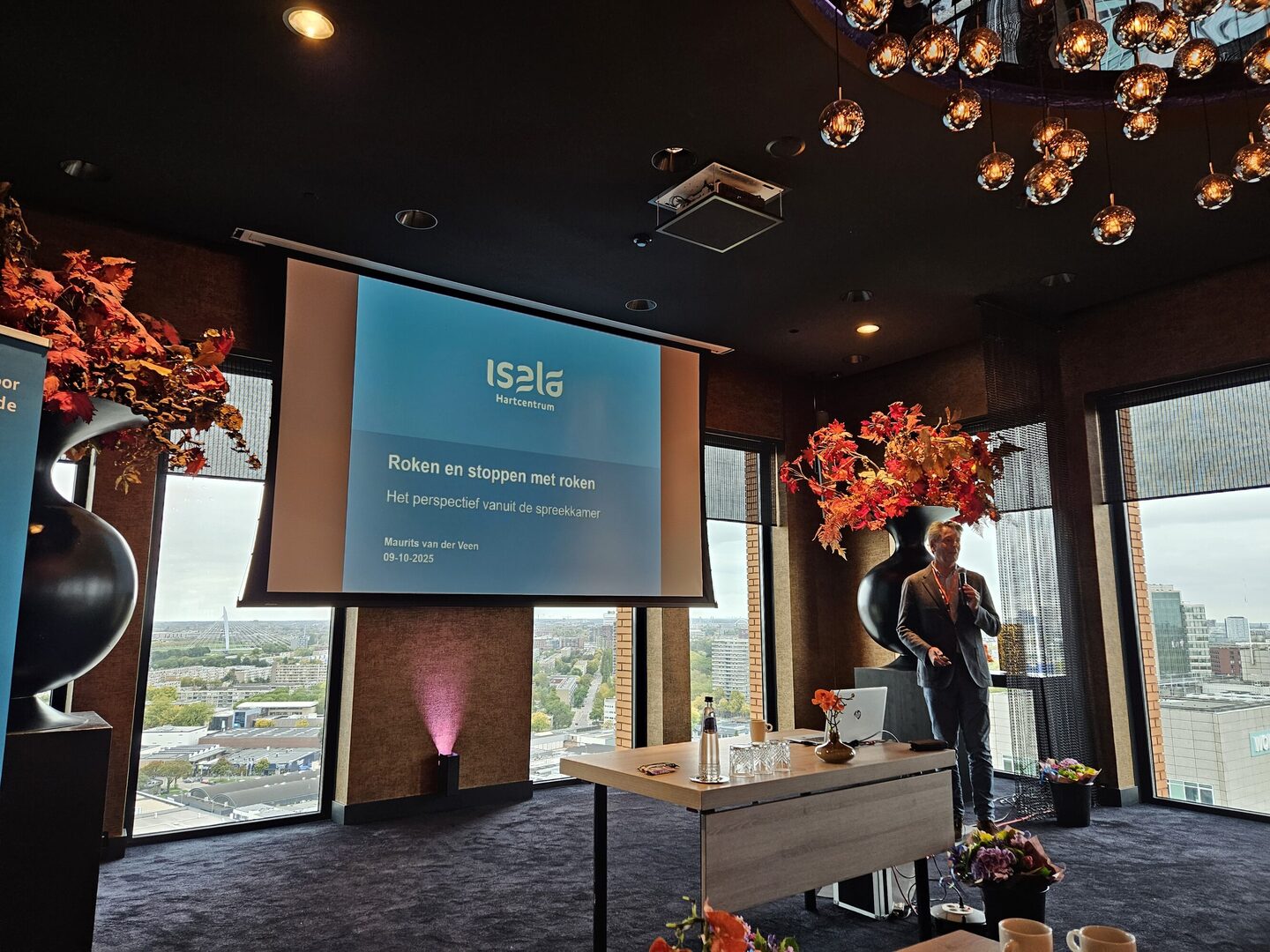 De tweede lezing was van cardioloog Maurits van der Veen, die zich toespitste op een ander leefstijl element. Roken was zijn eerste onderwerp en hij vertelde hoe de VBA-methode gebruikt wordt om mensen te stimuleren met roken te stoppen. VBA staat voor Very Brief Advice en feitelijk worden er drie vragen gesteld. Als op vraag drie bevestigend wordt geantwoord wordt de patiënt direct doorverwezen naar een coach die kan helpen. De drie vragen zijn heel simpel: Rookt u? Wist u dat er goede hulp is om te stoppen met roken? Vindt u het goed dat ik uw naam deel met iemand die u verder kan helpen?